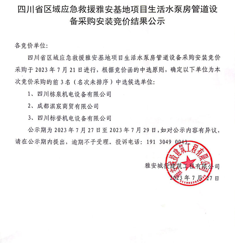四川省區(qū)域應(yīng)急救援雅安基地項(xiàng)目生活水泵房管道設(shè)備采購(gòu)安裝競(jìng)價(jià)結(jié)果公示