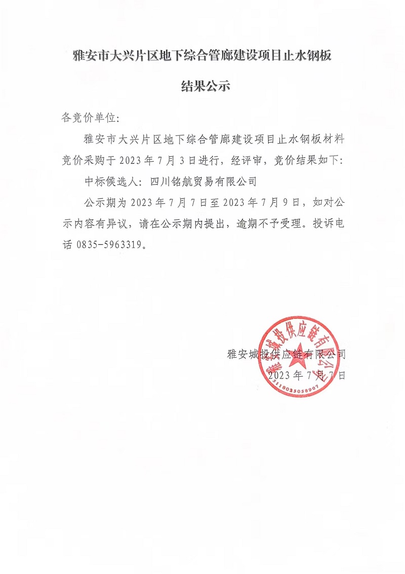 雅安市大興片區(qū)地下綜合管廊建設項目止水鋼板結(jié)果公示