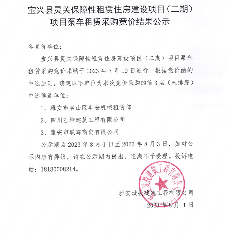 寶興縣靈關(guān)保障性租賃住房建設(shè)項(xiàng)目(二期)項(xiàng)目泵車租賃采購(gòu)競(jìng)價(jià)結(jié)果公示