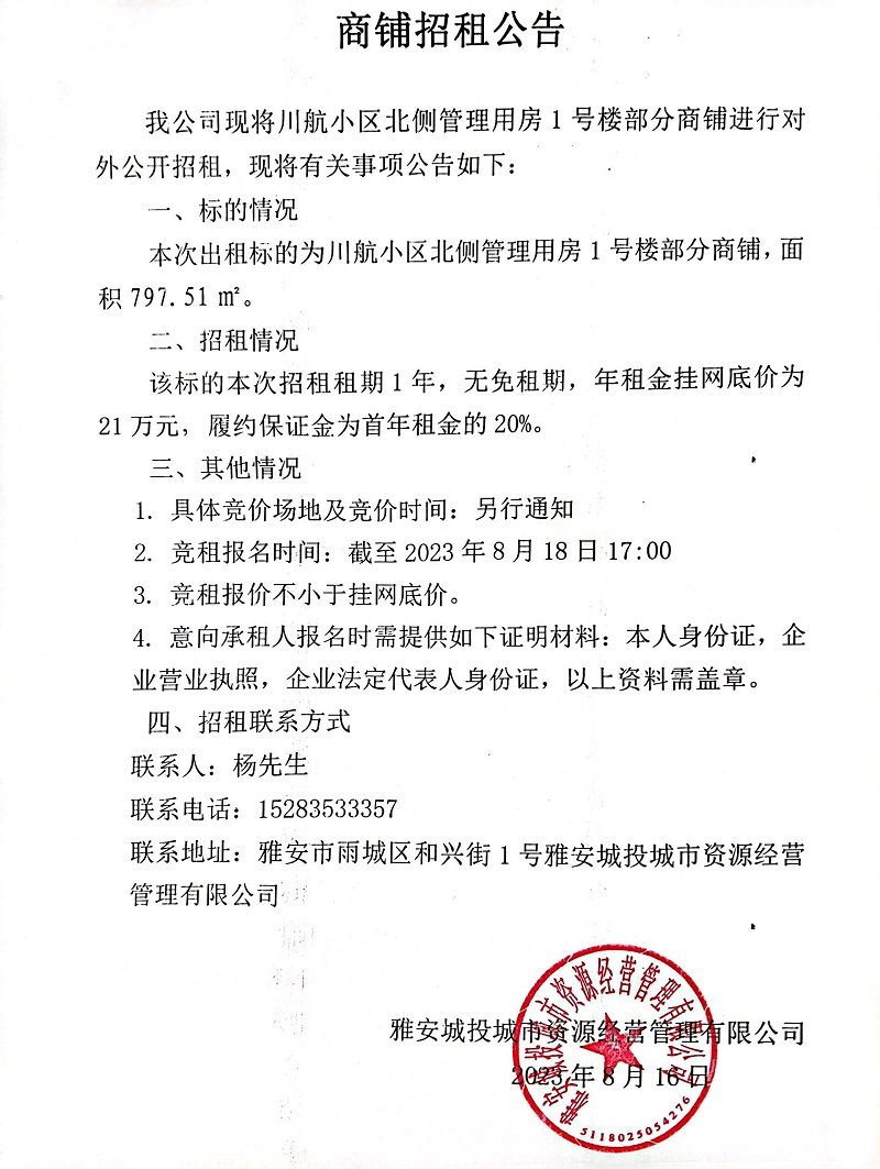 川航小區(qū)北側(cè)管理用房1號樓部分商鋪招租公告
