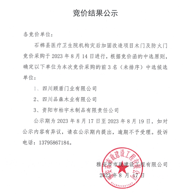 石棉縣醫(yī)療衛(wèi)生院機(jī)構(gòu)災(zāi)后加固改造項(xiàng)目木門及防火門競(jìng)價(jià)采購結(jié)果公示