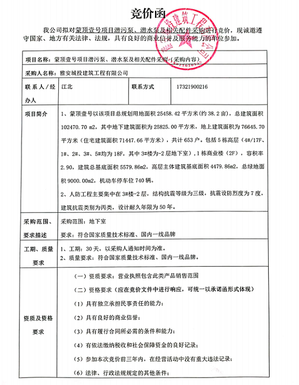蒙頂壹號項目潛污泵、潛水泵及相關配件采購競價公告