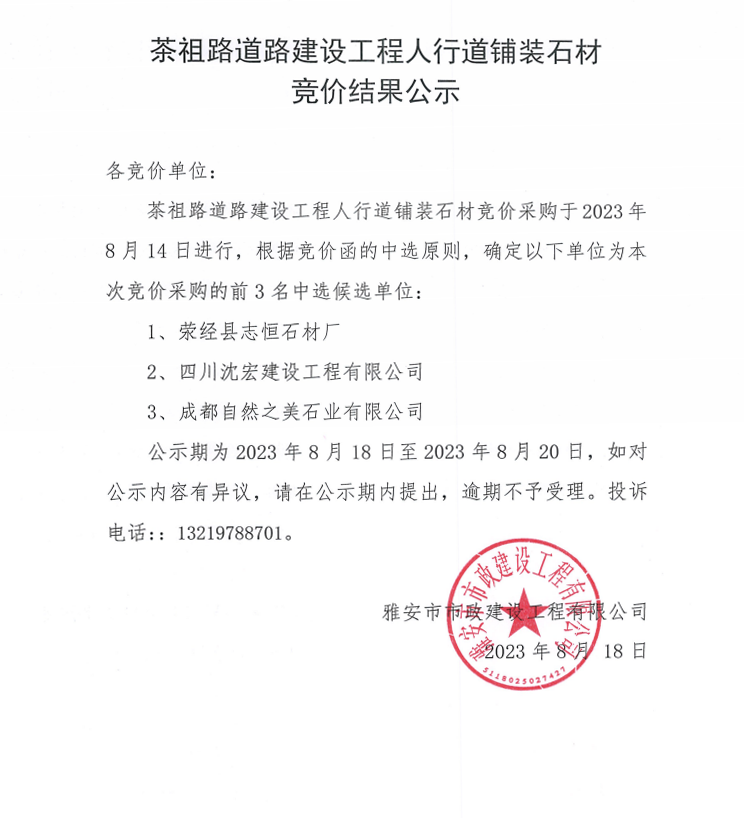 茶祖路道路建設工程人行道鋪裝石材競價結果公示