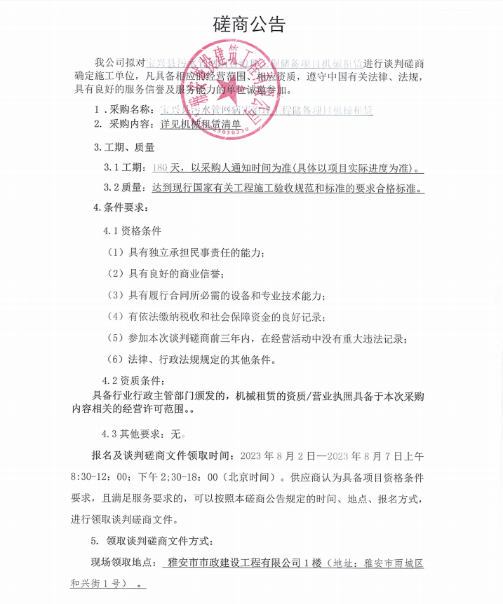 寶興縣污水管網(wǎng)病害治理工程儲(chǔ)備項(xiàng)目機(jī)械租賃談判磋商公告