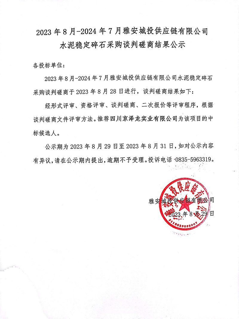 2023年8月-2024年7月雅安城投供應鏈有限公司水泥穩(wěn)定碎石采購談判磋商結(jié)果公示