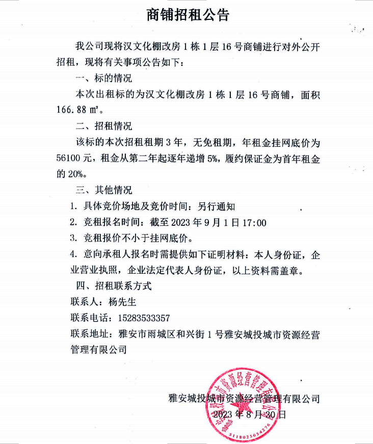 漢文化棚改房1棟1層16號(hào)商鋪招租公告