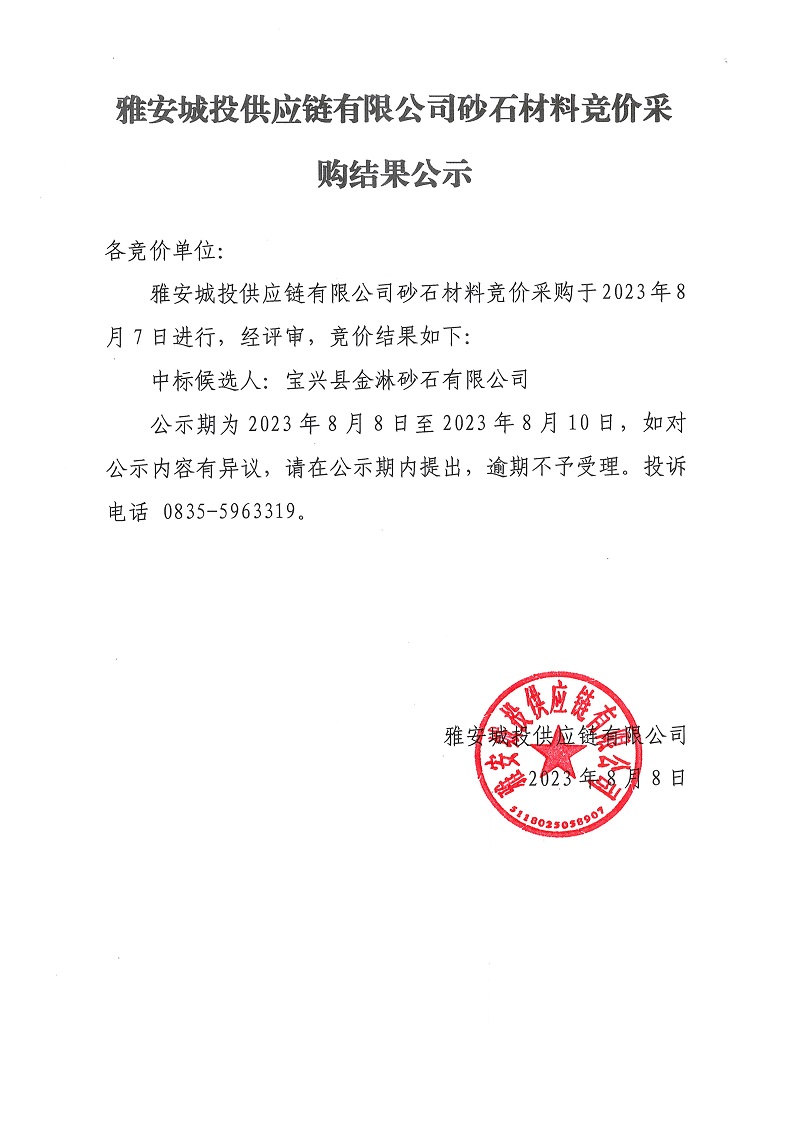 雅安城投供應(yīng)鏈有限公司砂石材料競價(jià)采購結(jié)果公示