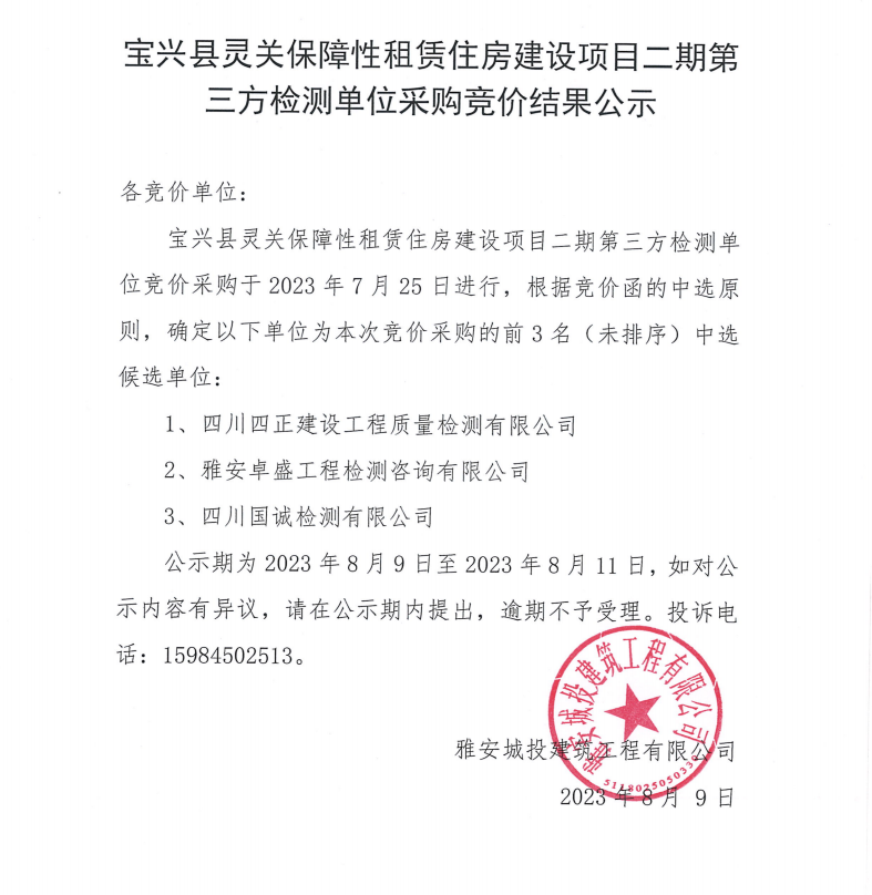 寶興縣靈關(guān)保障性租賃住房建設(shè)項目二期第三方檢測單位采購競價結(jié)果公示