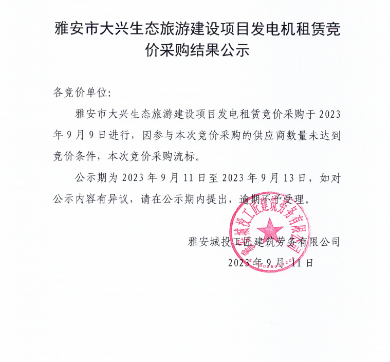 雅安市大興生態(tài)旅游建設項目發(fā)電機租賃競價采購結(jié)果公示