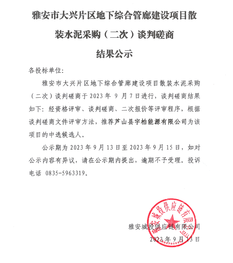 雅安市大興片區(qū)地下綜合管廊建設項目散裝水泥采購(二次)談判磋商結(jié)果公示