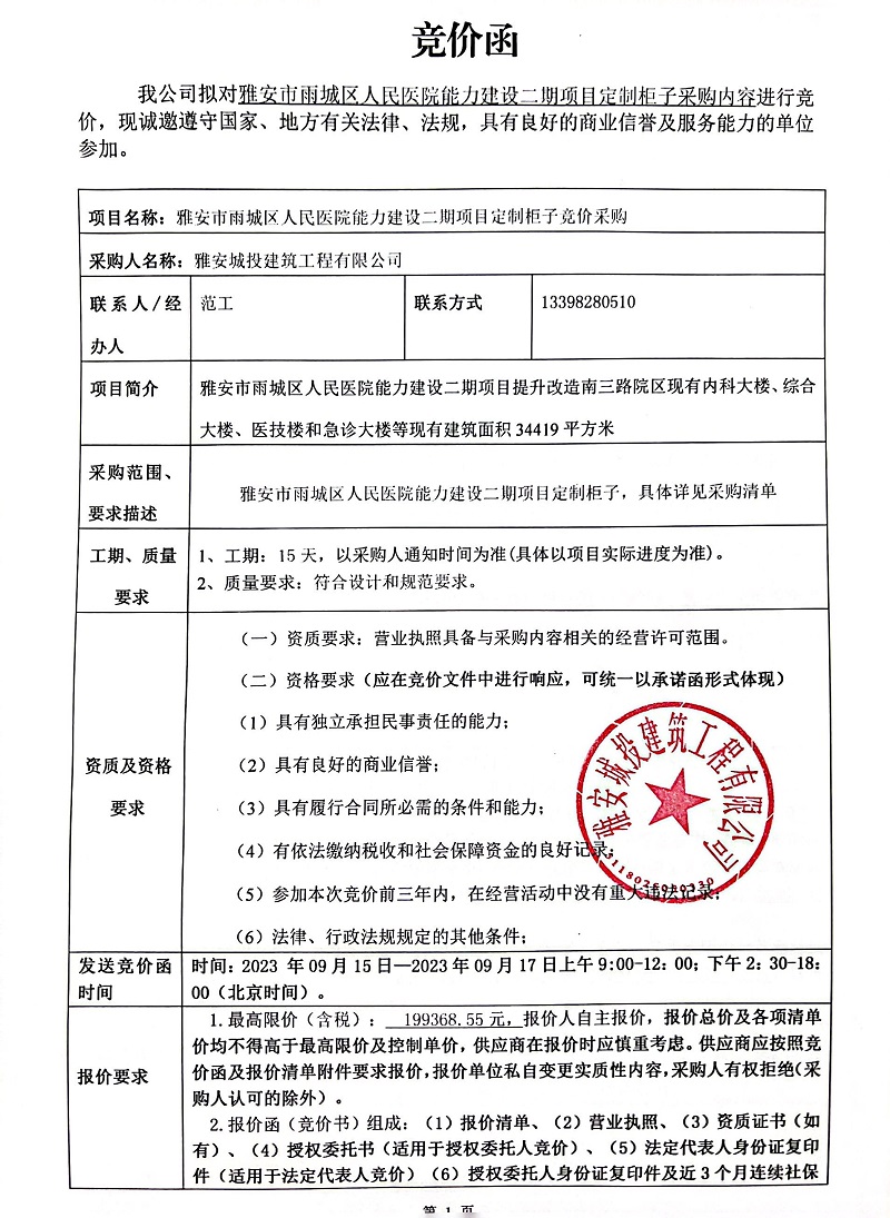 雅安市雨城區(qū)人民醫(yī)院能力建設(shè)二期項(xiàng)目定制柜子采購(gòu)競(jìng)價(jià)公告