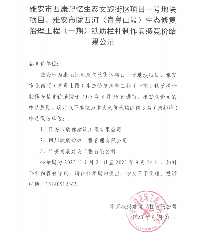 雅安市西康記憶生態(tài)文旅街區(qū)項目一號地塊項目、雅安市隴西河(青鼻山段)生態(tài)修復治理工程(一期)鐵質欄桿制作安裝競價結果公示