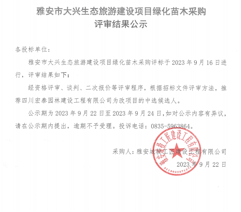 雅安市大興生態(tài)旅游建設項目綠化苗木采購評審結果公示