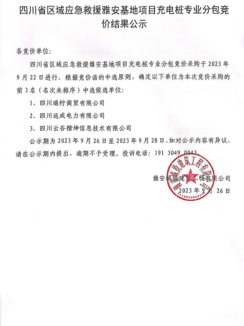 四川省區(qū)域應(yīng)急救援雅安基地項目充電樁專業(yè)分包競價結(jié)果公示