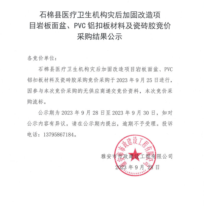 石棉縣醫(yī)療衛(wèi)生機(jī)構(gòu)災(zāi)后加固改造項(xiàng)目巖板面盆、PVC鋁扣板材料及瓷磚膠競價(jià)采購結(jié)果公示