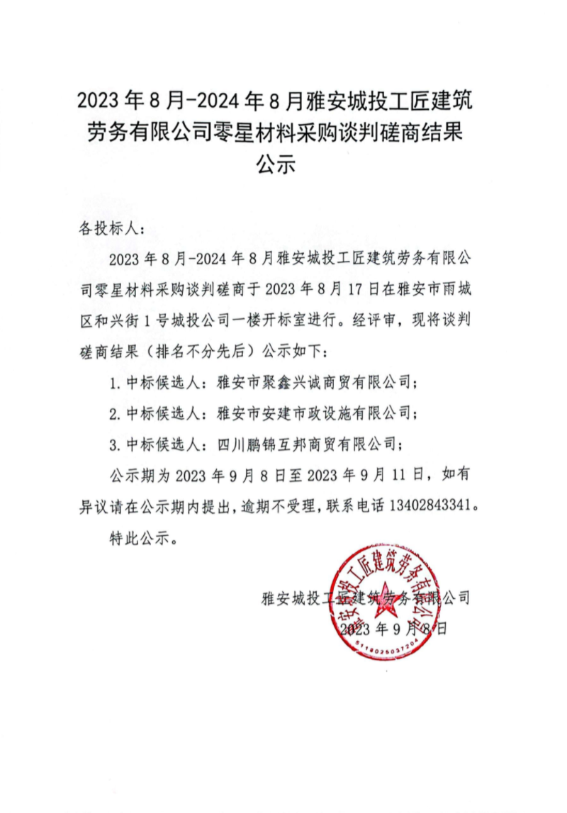 2023年8月-2024年8月雅安城投工匠建筑勞務有限公司零星材料采購談判磋商結(jié)果公示