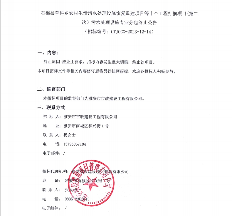石棉縣草科鄉(xiāng)農(nóng)村生活污水處理設(shè)施恢復(fù)重建項(xiàng)目等十個(gè)工程打捆項(xiàng)目(第二次)污水處理設(shè)施專(zhuān)業(yè)分包終止公告