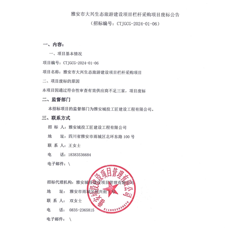 雅安市大興生態(tài)旅游建設(shè)項(xiàng)目欄桿采購項(xiàng)目廢標(biāo)公告