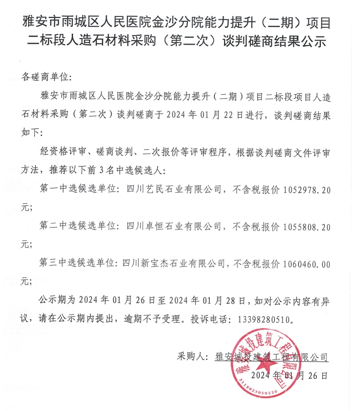 雅安市雨城區(qū)人民醫(yī)院金沙分院能力提升(二期)項目二標段人造石材料采購(第二次)談判磋商結(jié)果公示