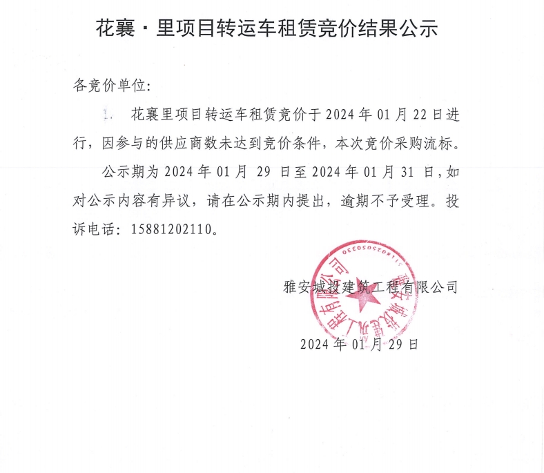 花襄·里項目轉(zhuǎn)運車租賃競價結果公示