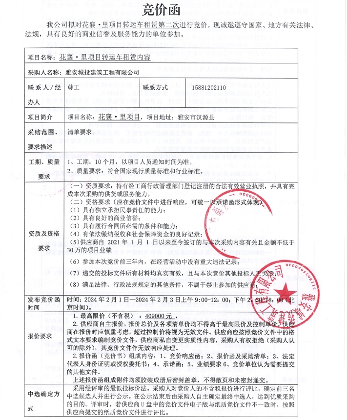 花襄·里項目轉運車租賃(第二次)競價公告