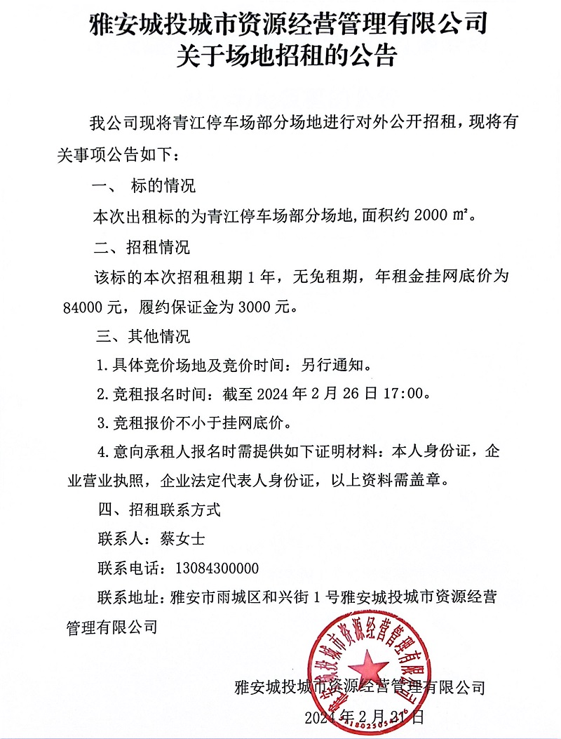 雅安城投城市資源經(jīng)營管理有限公司關(guān)于場地招租的公告