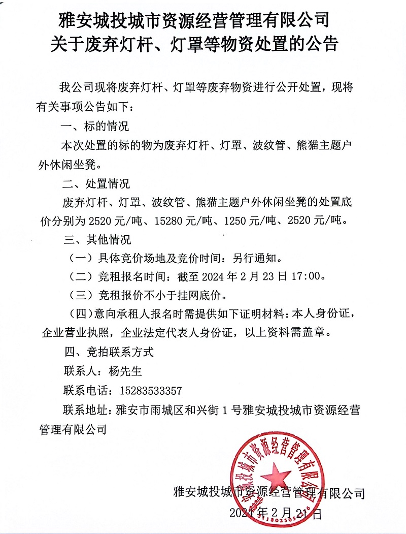 雅安城投城市資源經(jīng)營管理有限公司關(guān)于廢棄燈桿、燈罩等物資處置的公告
