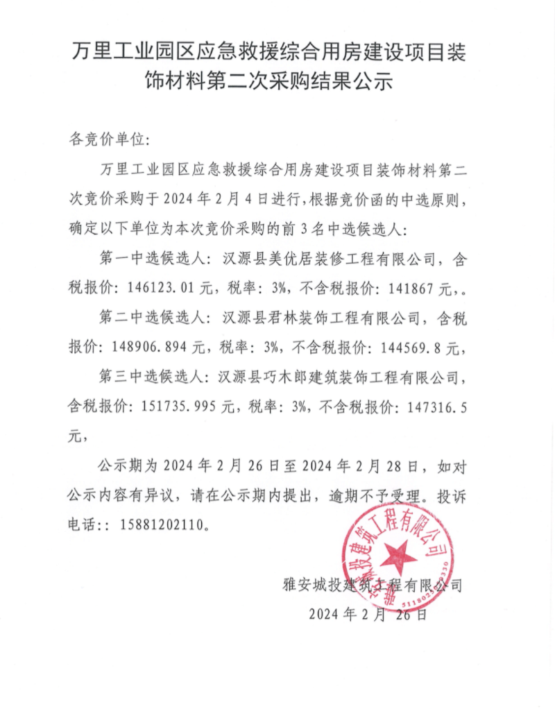 萬里工業(yè)園區(qū)應急救援綜合用房建設項目裝飾材料第二次采購結果公示