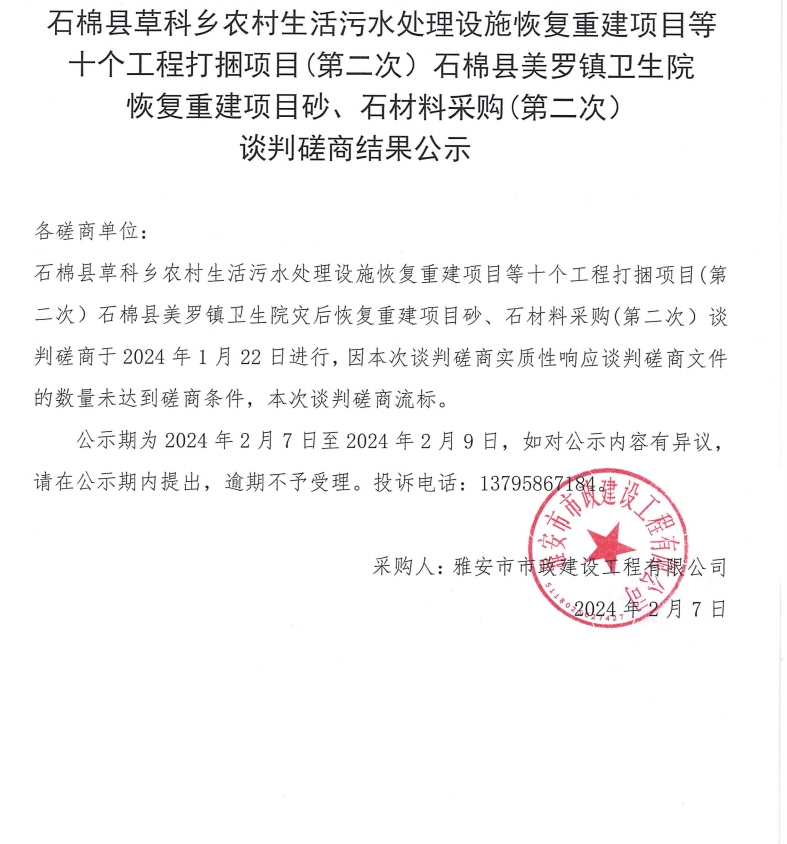 石棉縣草科鄉(xiāng)農(nóng)村生活污水處理設(shè)施恢復(fù)重建項目等十個工程打捆項目(第二次)石棉縣美羅鎮(zhèn)衛(wèi)生院恢復(fù)重建項目砂、石材料采購(第二次)談判磋商結(jié)果公示