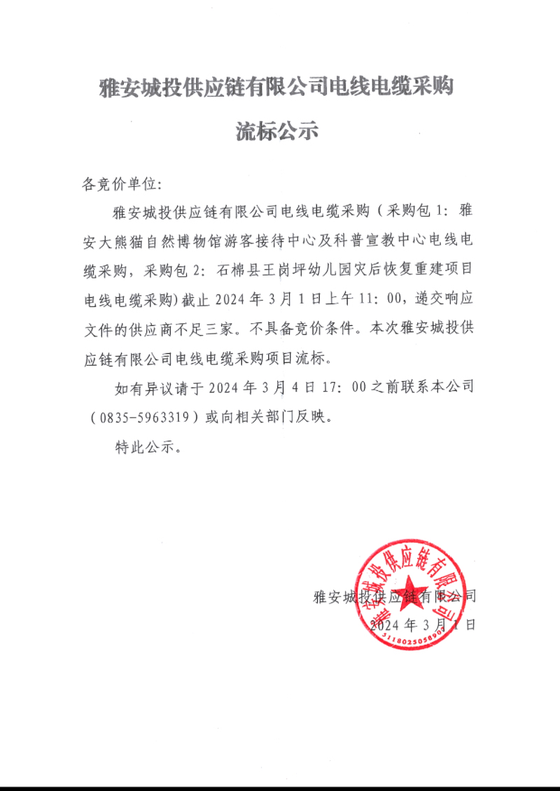 雅安城投供應(yīng)鏈有限公司電線電纜采購流標公示