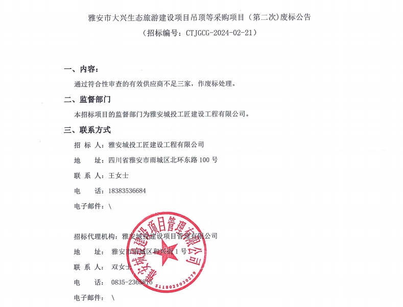 雅安市大興生態(tài)旅游建設項目吊頂等采購項目(第二次)廢標公告