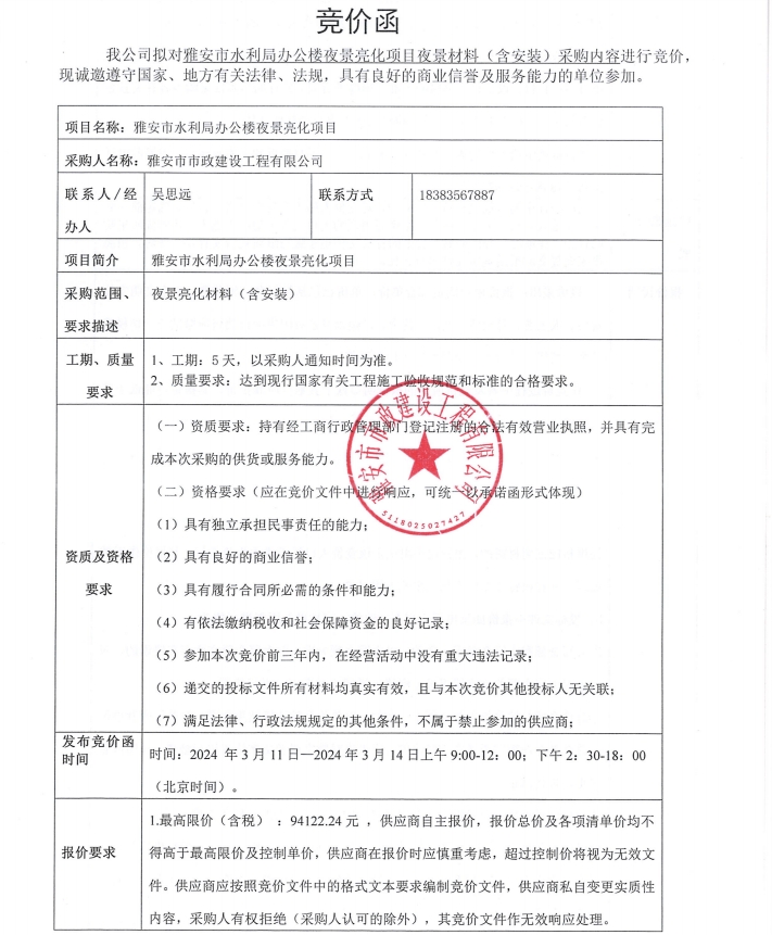 雅安市水利局辦公樓夜景亮化項(xiàng)目夜景材料(含安裝)采購內(nèi)容競價(jià)公告