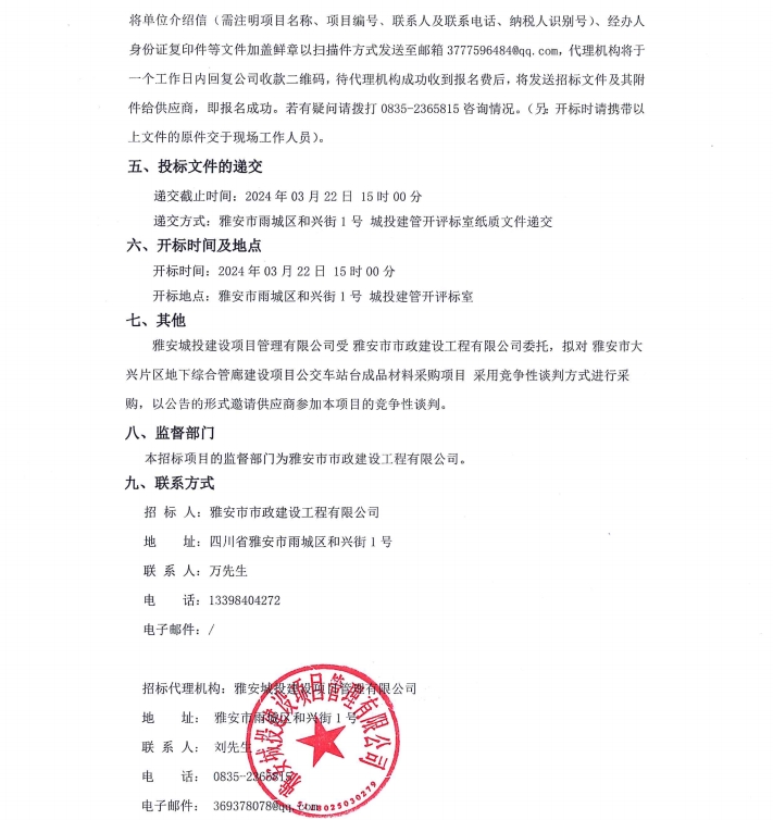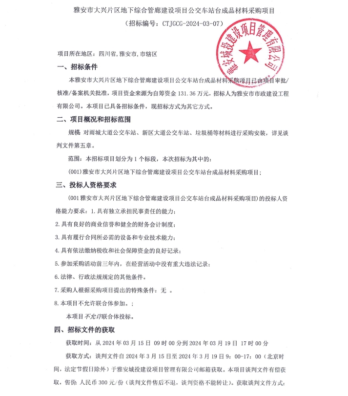 雅安市大興片區(qū)地下綜合管廊建設項目公交車站臺成品材料采購項目公告