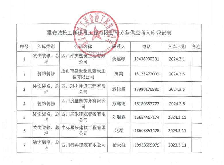 雅安城投工匠建設有限公司勞務供應商入庫登記公示