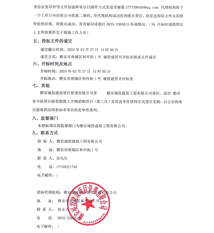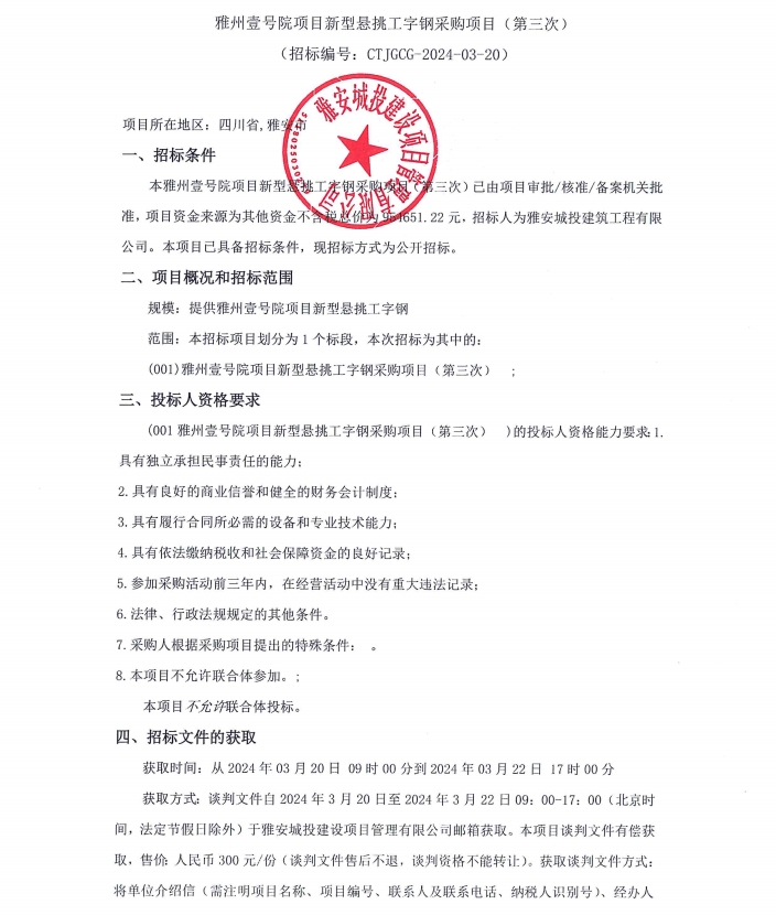 雅州壹號(hào)院項(xiàng)目新型懸挑工字鋼采購(gòu)(第三次)公告