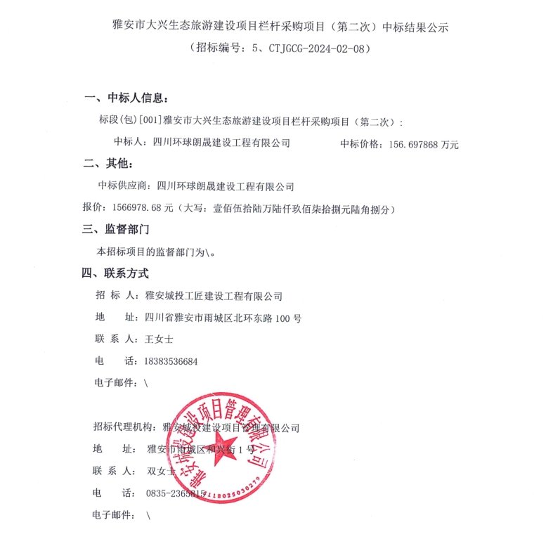 雅安市大興生態(tài)旅游建設(shè)項(xiàng)目欄桿采購項(xiàng)目(第二次)中標(biāo)結(jié)果公示