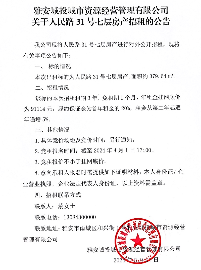 雅安城投城市資源經(jīng)營管理有限公司關(guān)于人民路31號七層房產(chǎn)招租的公告