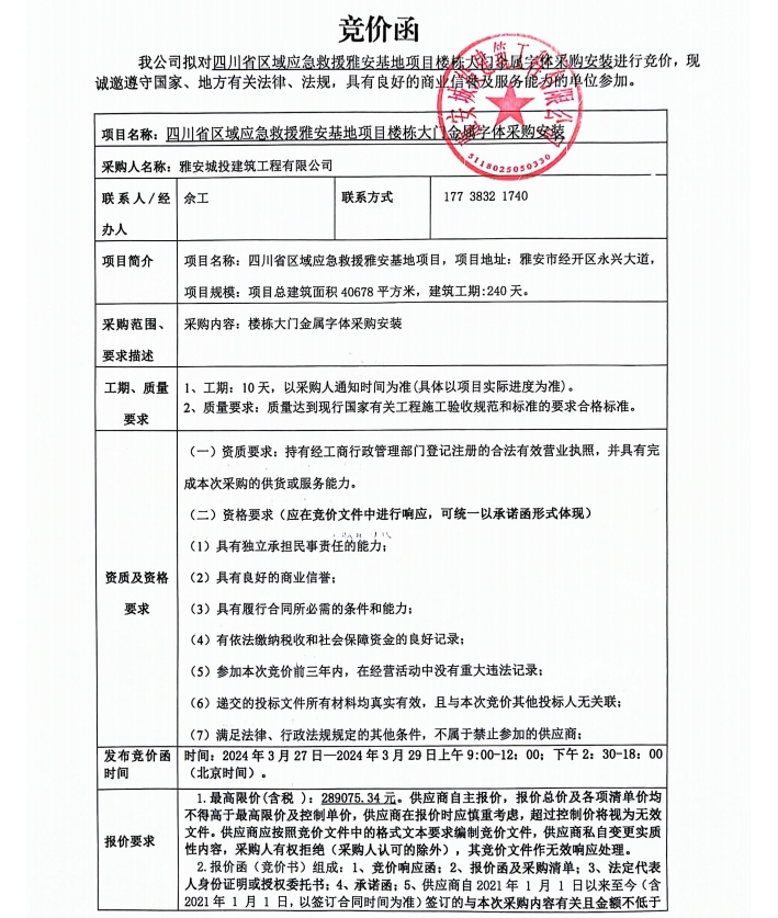 四川省區(qū)域應急救援雅安基地項目樓棟大門金屬字體采購安裝競價公告