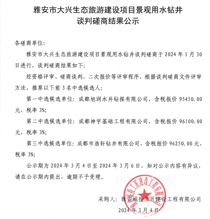 雅安市大興生態(tài)旅游建設(shè)項(xiàng)目景觀用水鉆井談判磋商結(jié)果公示
