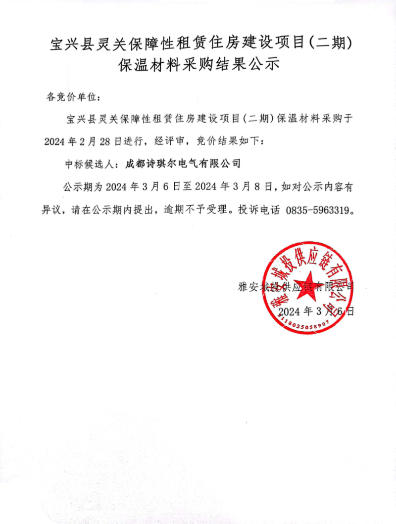 寶興縣靈關(guān)保障性租賃建設(shè)項目(二期)保溫材料采購結(jié)果公示