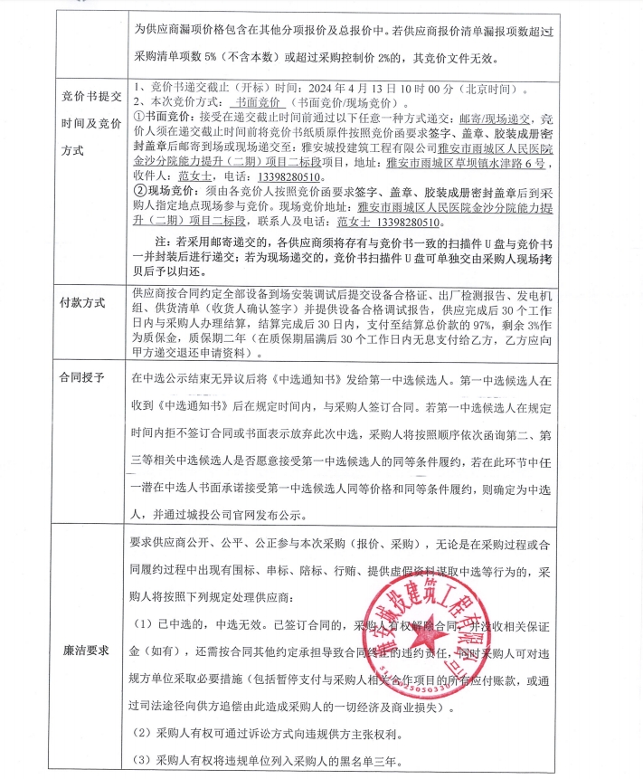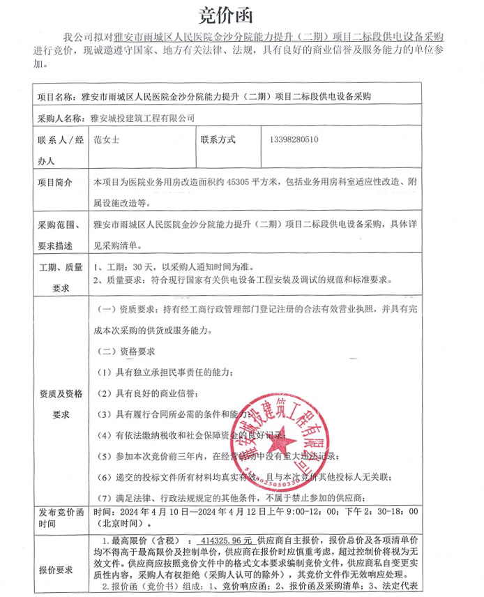 雅安市雨城區(qū)人民醫(yī)院金沙分院能力提升(二期)項(xiàng)目二標(biāo)段供電設(shè)備采購(gòu)競(jìng)價(jià)公告