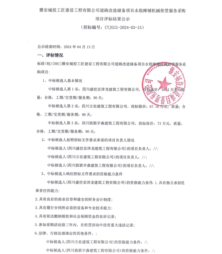 雅安城投工匠建設(shè)工程有限公司道路改造儲備項(xiàng)目水穩(wěn)攤鋪機(jī)械租賃服務(wù)采購項(xiàng)目評標(biāo)結(jié)果公示