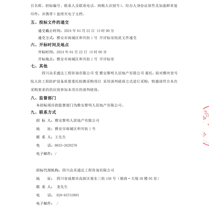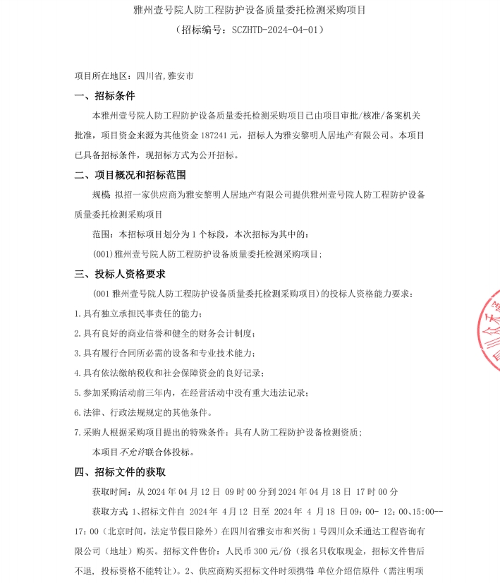 雅州壹號院人防工程防護(hù)設(shè)備質(zhì)量委托檢測采購項(xiàng)目公告