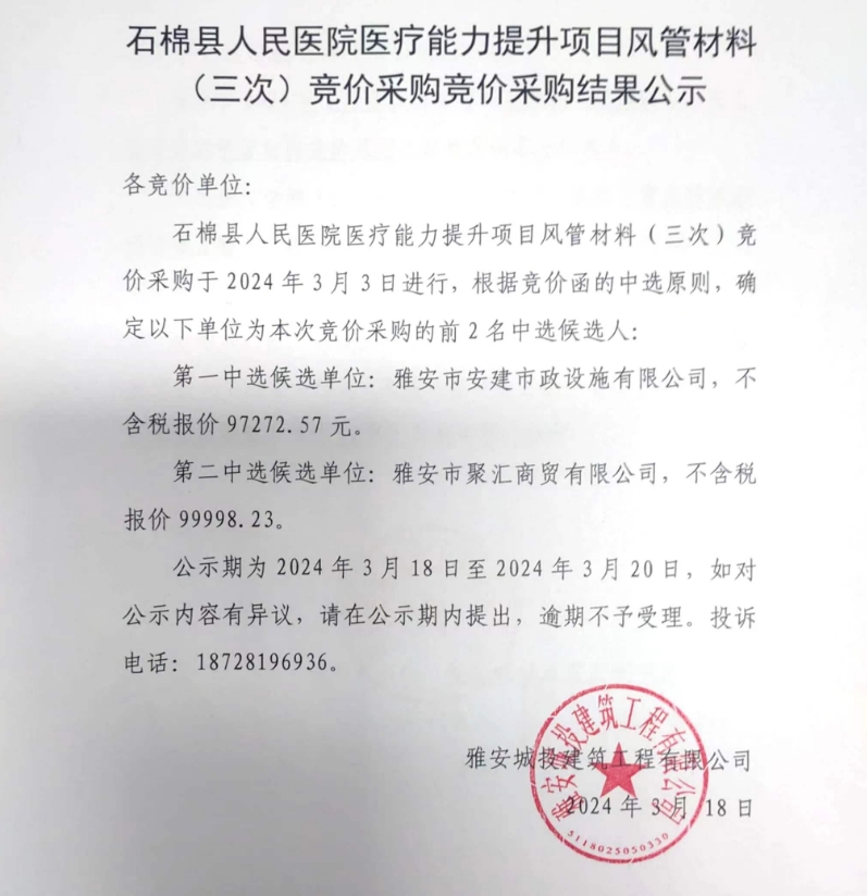 石棉縣人民醫(yī)院醫(yī)療能力提升項目風管材料(三次)競價采購競價采購結(jié)果公示