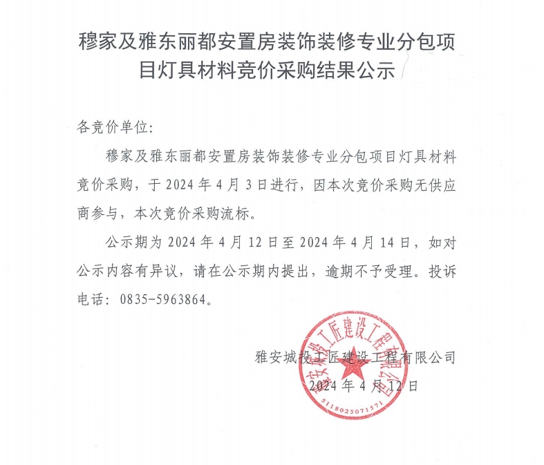 穆家及雅東麗都安置房裝飾裝修專業(yè)分包項(xiàng)目燈具材料競價(jià)采購結(jié)果公示