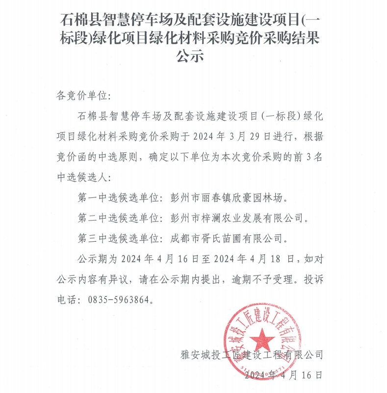 石棉縣智慧停車場及配套設(shè)施建設(shè)項(xiàng)目(一標(biāo)段)綠化項(xiàng)目綠化材料采購競價(jià)采購結(jié)果公示