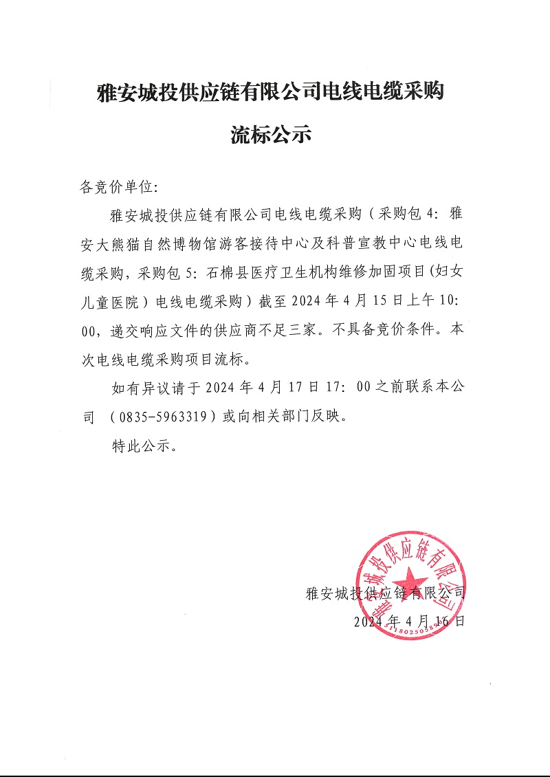 雅安城投供應(yīng)鏈有限公司電線電纜采購(gòu)流標(biāo)公示