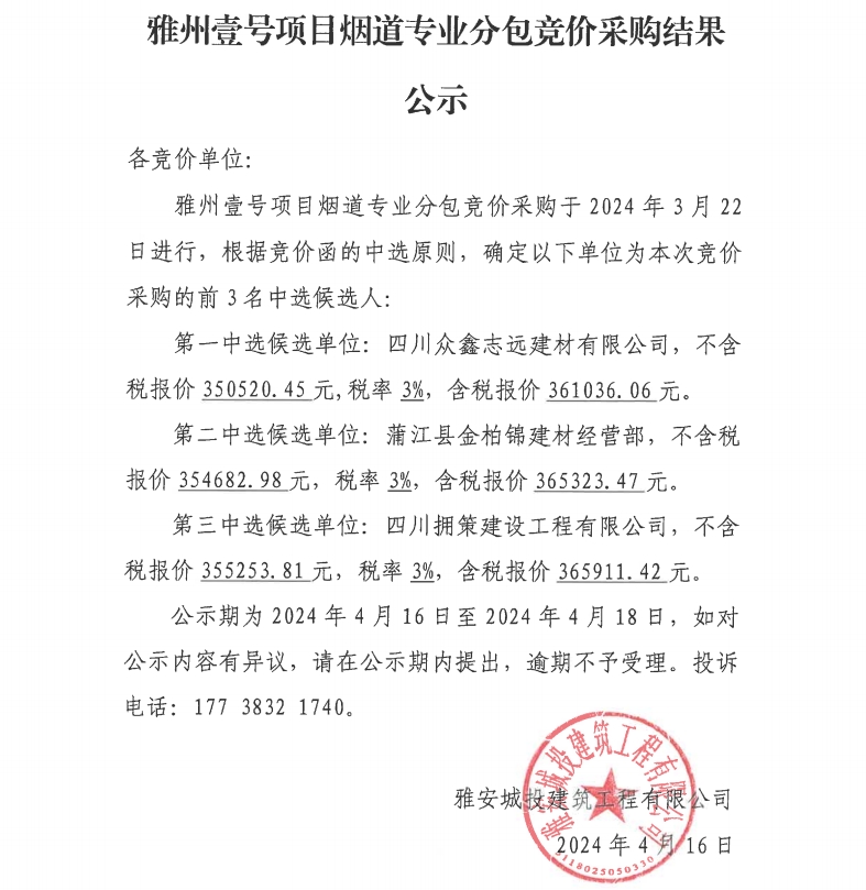 雅州壹號(hào)項(xiàng)目煙道專業(yè)分包競(jìng)價(jià)采購結(jié)果公示