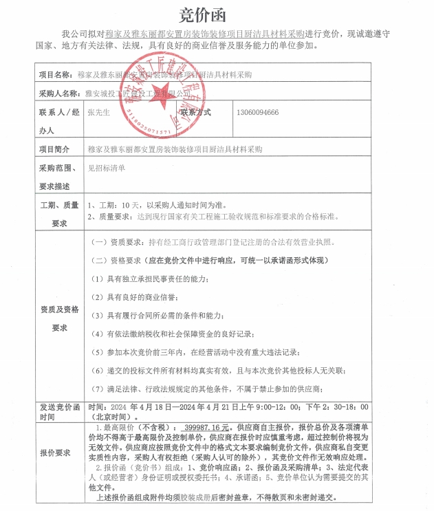 穆家及雅東麗都安置房裝飾裝修項(xiàng)目廚潔具材料采購(第三次)競價公告