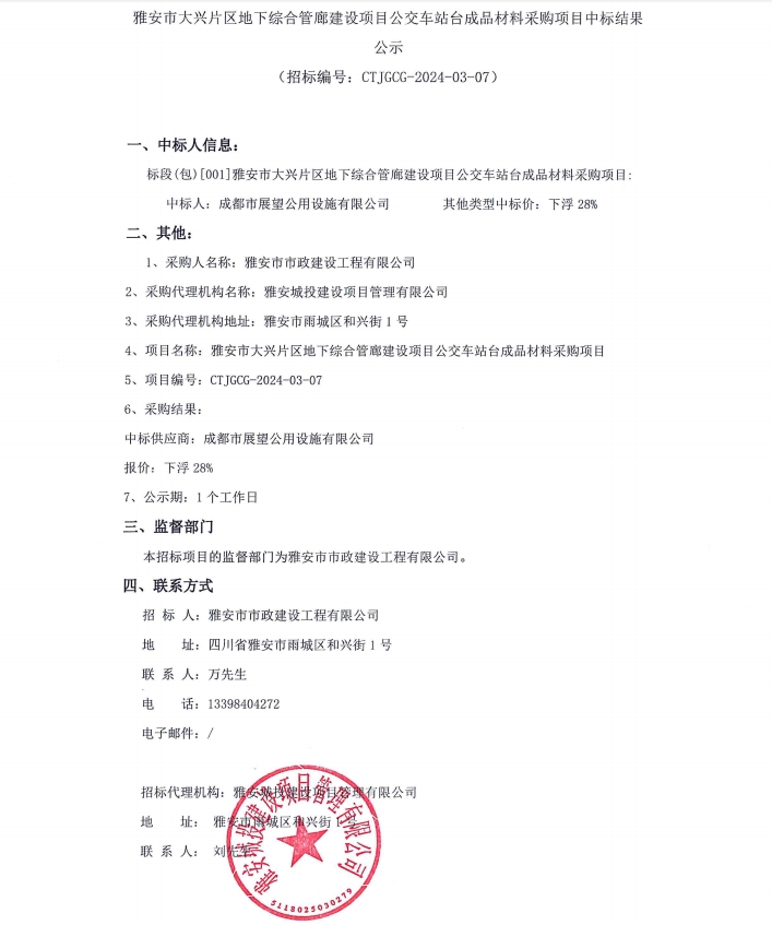 雅安市大興片區(qū)地下綜合管廊建設(shè)項(xiàng)目公交車站臺成品材料采購項(xiàng)目中標(biāo)結(jié)果公示